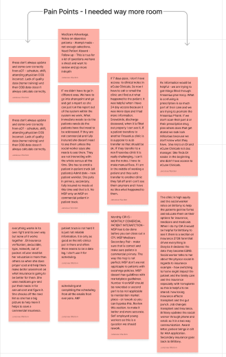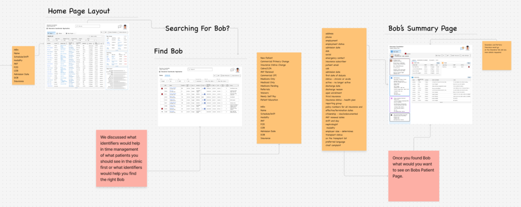 This was an incredible research project. We interviewed insurance coordinators, their job is to make sure patients maintain or become fully insured so that they are not worried about finances and can prioritize their health. The dedication these people have to their work and patients was incredible. I was so lucky to be a part of this project. As a team we started off by designing protocols for the questions and information we wanted to gather so that when we went to clinics our information we gathered would be from the same set of questions. We also followed insurance coordinators around in the clinics and learning about their jobs. Then we learned about the software they currently use for their job. We met with them over teams in many follow up meetings, we met with supervisors, and we held online workshops with them to go over our data and wireframes.