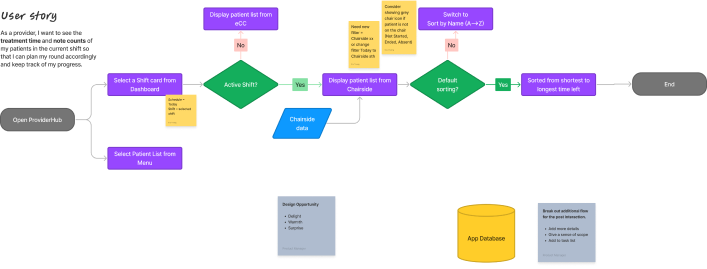 Problem: Providers struggled to prioritize patients while they were in the clinic. They were unable to tell how long the patient had left to finish treatment and how much time they had left to spend with the patient. This needed to be approached with APIs directly to the application on the dialysis chair. We also needed to rethink the entire approach to how the application was serving not just as a way to document, but as a way to actually perform “rounds.”