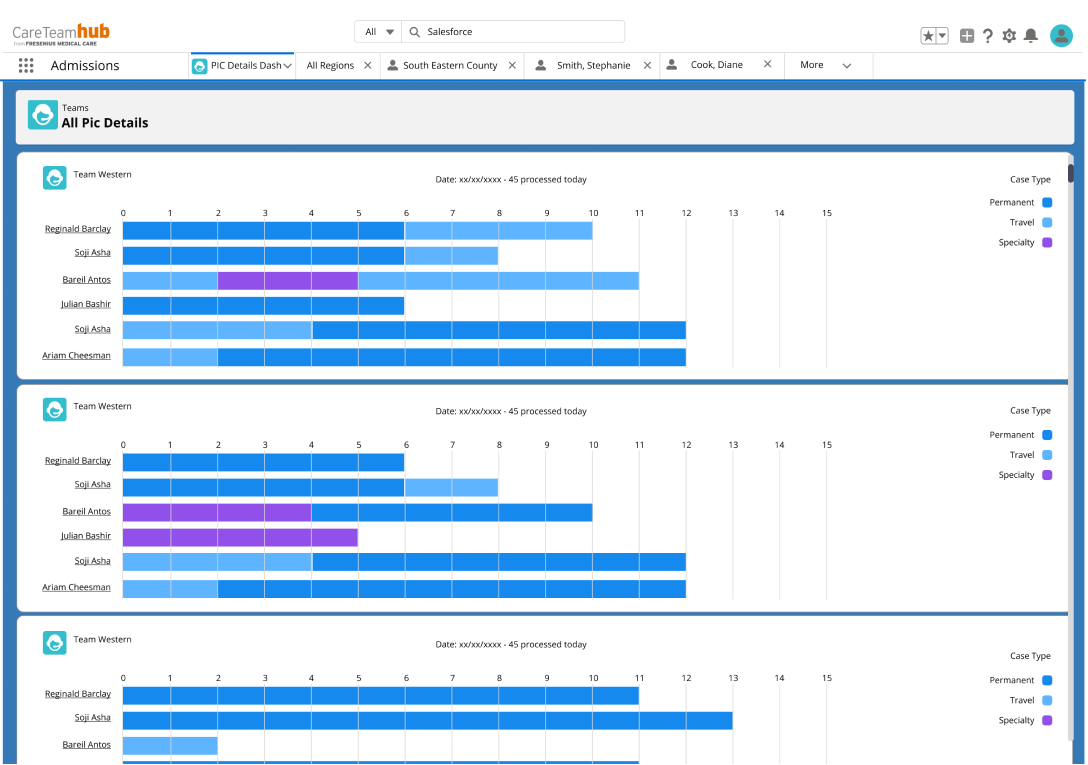 Then using the Salesforce platform I designed dashboards so the supervisors could see how teams were doing overall or see detailed views of each teams performance. They could see how many admissions each person processed per day and how many each team processed per day, week, month and year.