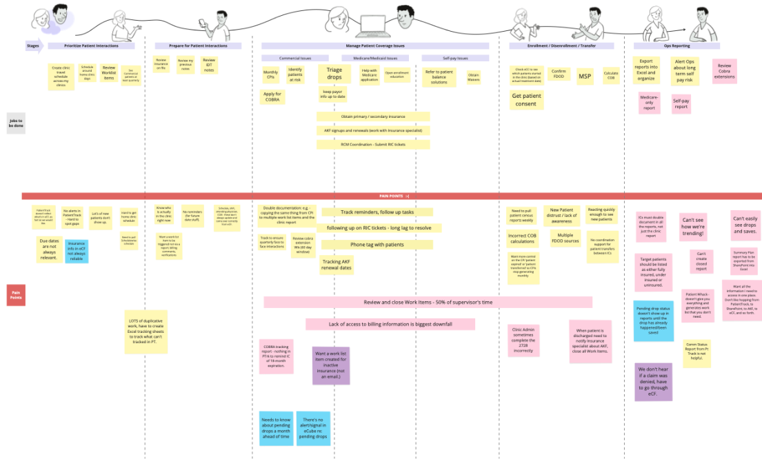 This was an incredible research project. We interviewed insurance coordinators, their job is to make sure patients maintain or become fully insured so that they are not worried about finances and can prioritize their health. The dedication these people have to their work and patients was incredible. I was so lucky to be a part of this project. As a team we started off by designing protocols for the questions and information we wanted to gather so that when we went to clinics our information we gathered would be from the same set of questions. We also followed insurance coordinators around in the clinics and learning about their jobs. Then we learned about the software they currently use for their job. We met with them over teams in many follow up meetings, we met with supervisors, and we held online workshops with them to go over our data and wireframes.